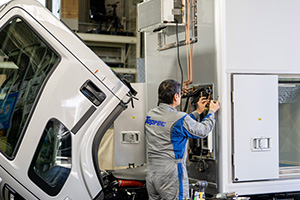 冷凍車の点検、修理も行っています。冷凍機を専門に取り付ける専門担当者も在籍します。